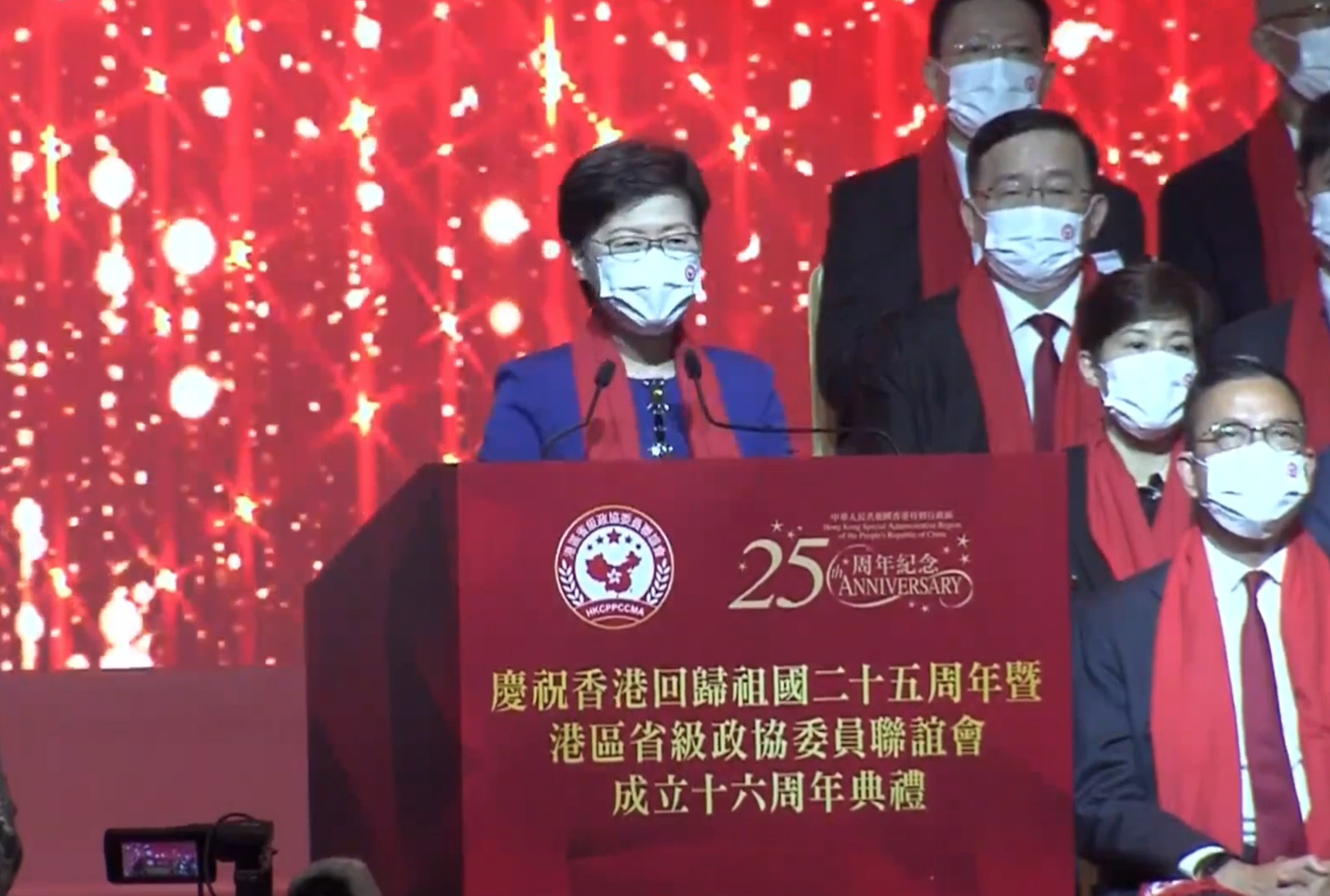 行政長官林鄭月娥在致辭時表示,過去五年是回歸以來最困難的五年,面對最多的挑戰。但不論問題和挑戰有多大,中央永遠是香港最堅強的后盾。過去兩年香港在中央的指導下頒布了香港國安法及完善選舉制度,相信只要特區政府確保“愛國者治港”的原則,香港會再創輝煌。