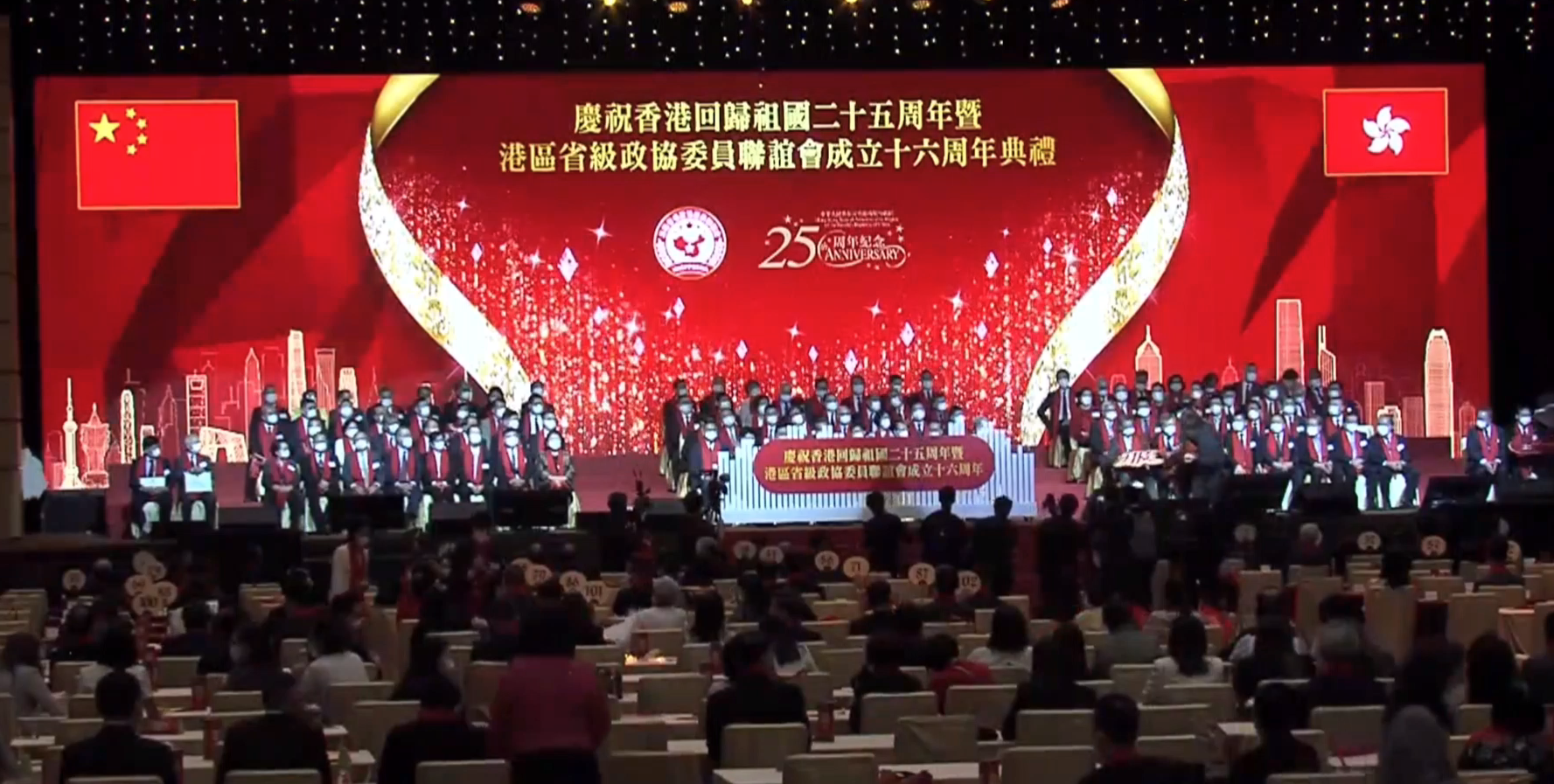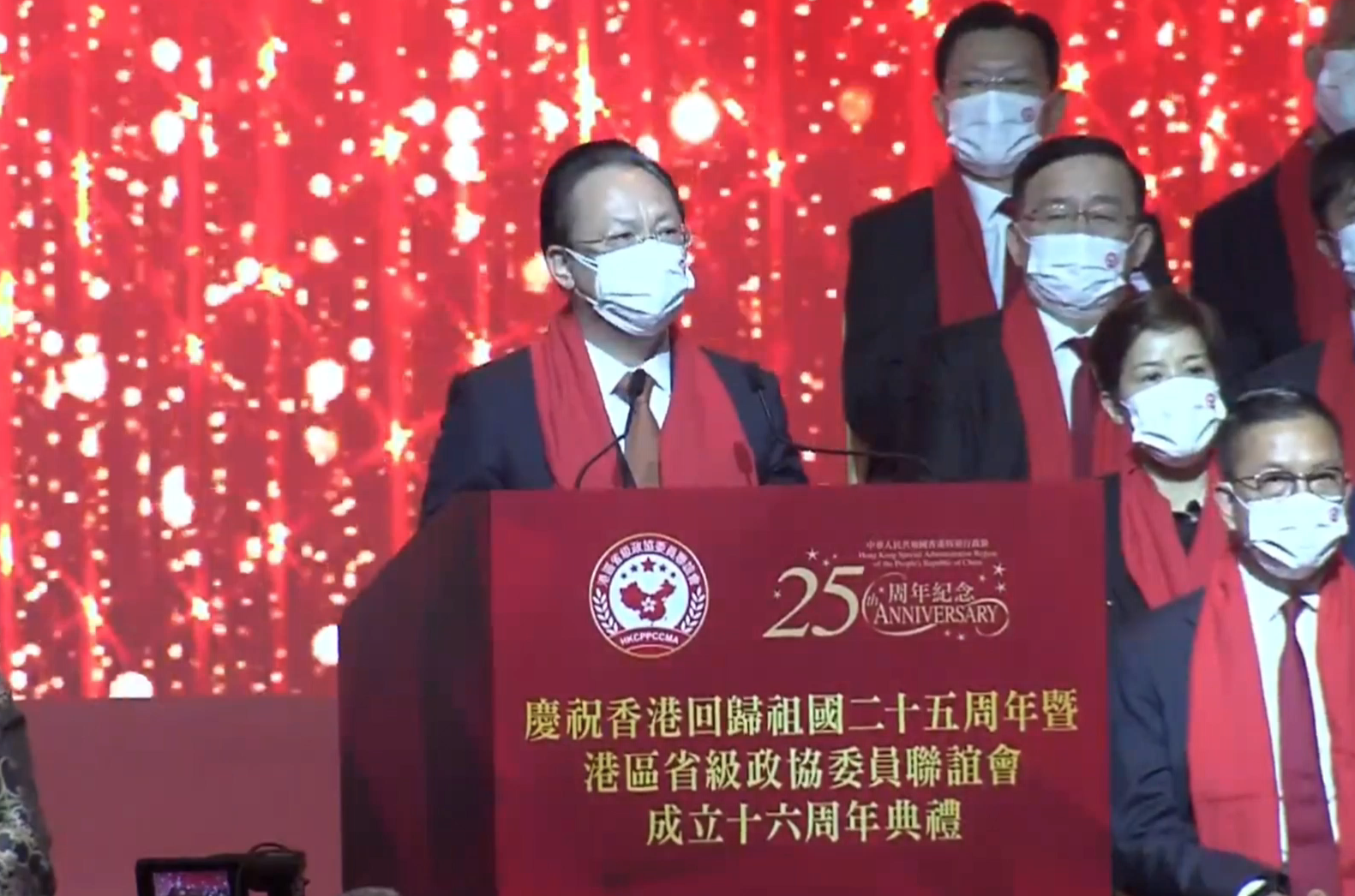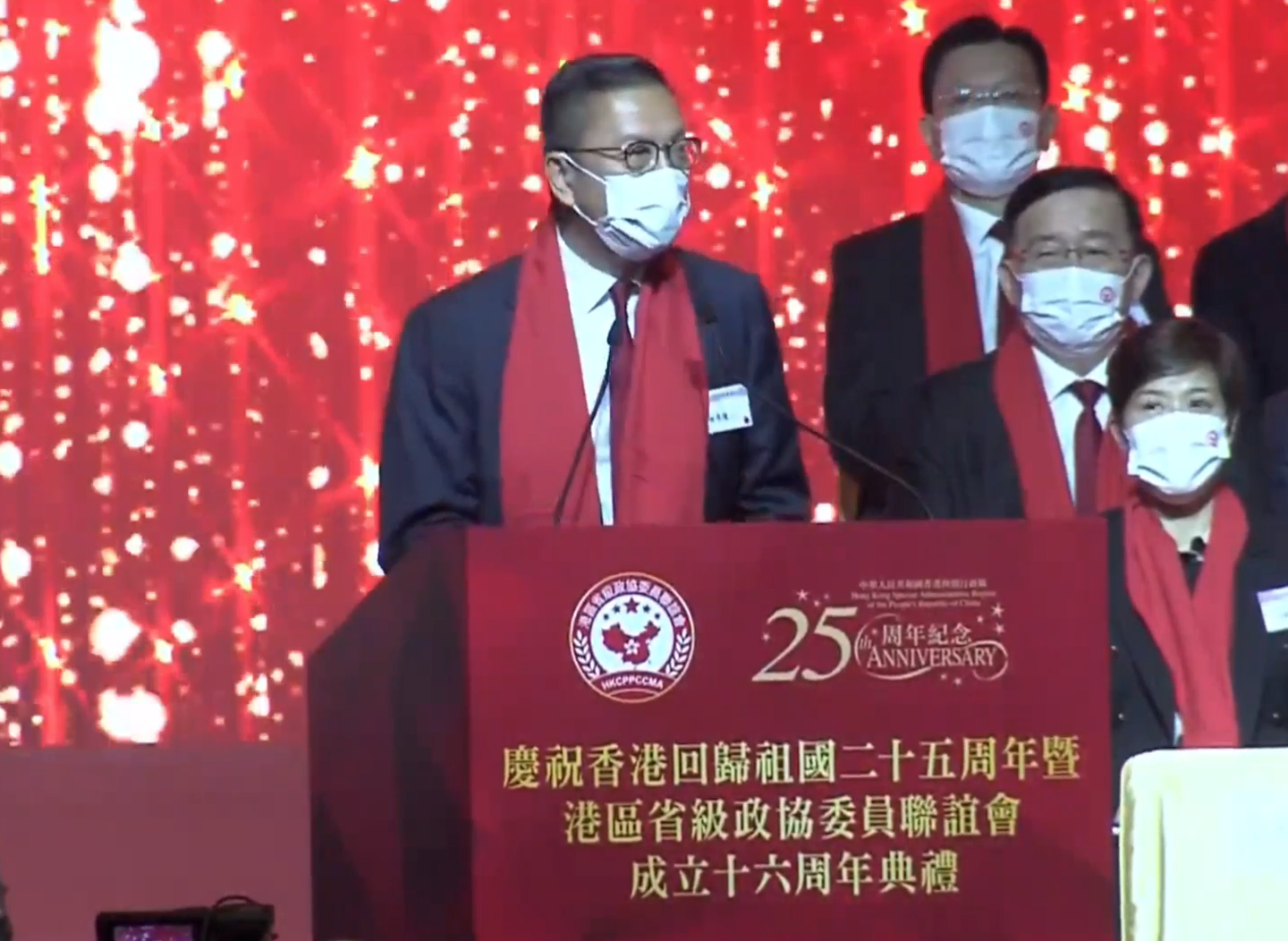 香港中聯辦副主任譚鐵牛表示,香港回歸祖國25周年,經歷了亞洲金融風暴、非典、修例風波及新冠疫情等挑戰,但“一國兩制”在香港實踐取得了舉世公認的成功。他勉勵港區省級政協委員在關鍵時期發揮關鍵作用,提高政治地位,融入國家發展大局、支持特區政府和行政長官依法施政,以及深入基層,亦要促進中外友好交流,增加外國對“一國兩制”的認識。