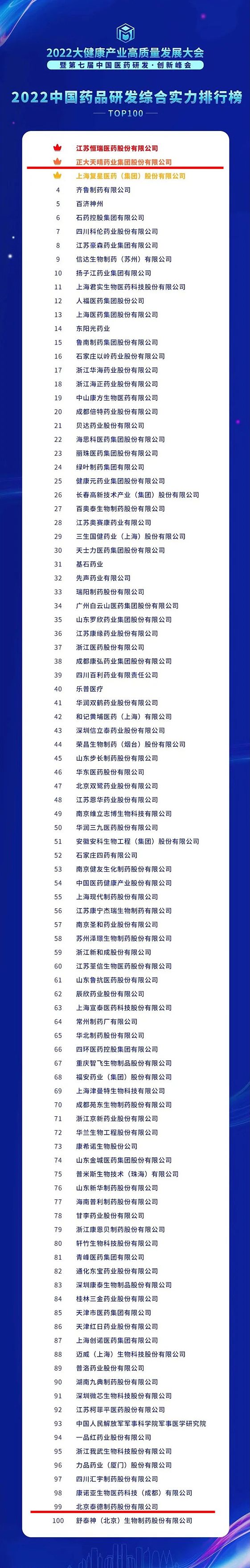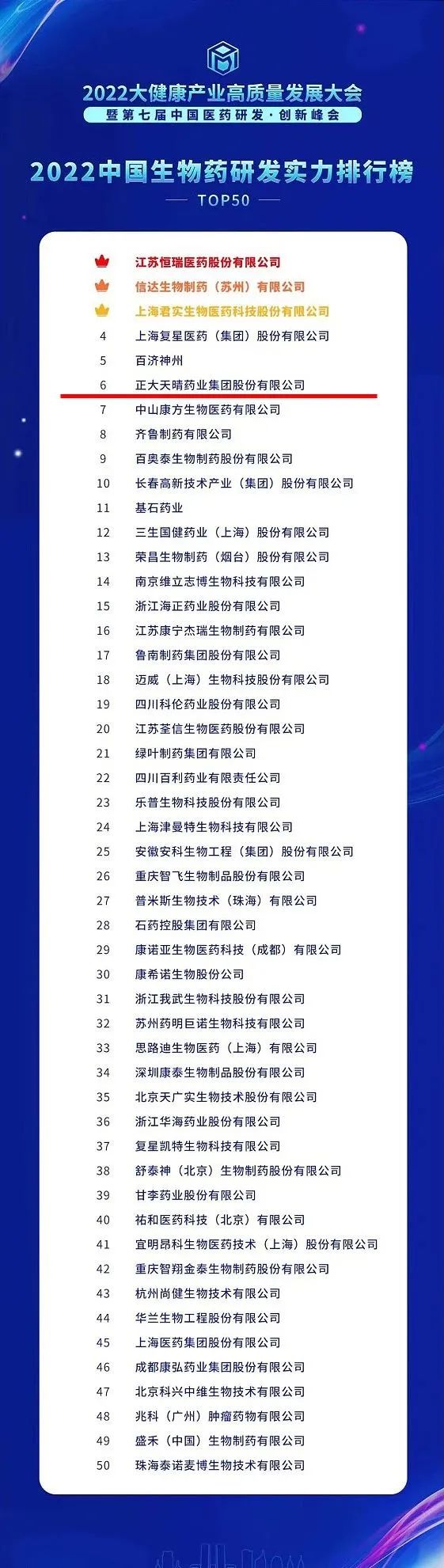 12月9日,“2022中國藥品研發(fā)實力排行榜系列榜單”在“ 2022大健康產(chǎn)業(yè)高質(zhì)量發(fā)展大會暨第七屆中國醫(yī)藥研發(fā)•創(chuàng)新峰會”上隆重發(fā)布。中國生物制藥成員企業(yè)正大天晴榮登 “2022中國藥品研發(fā)綜合實力排行榜TOP100”、“2022中國化藥研發(fā)實力排行榜TOP100” 及 “2022中國生物藥研發(fā)實力排行榜TOP50” 三大榜單,分別位列第二名、第二名及第六名。