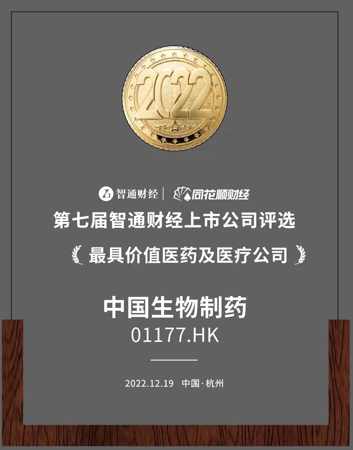 近日,“第七屆智通財經上市公司評選” 結果出爐。中國生物制藥(01177.HK)憑借突出的綜合實力以及創新能力,榮獲 “最具價值醫藥及醫療公司” 大獎。