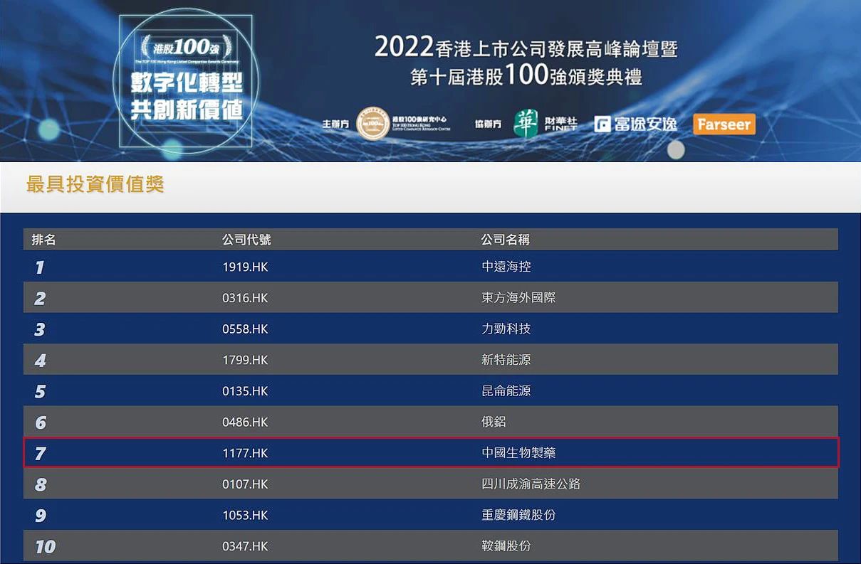 中國生物制藥入選港股 100 強(qiáng)并榮獲 “最具投資價(jià)值獎(jiǎng)”