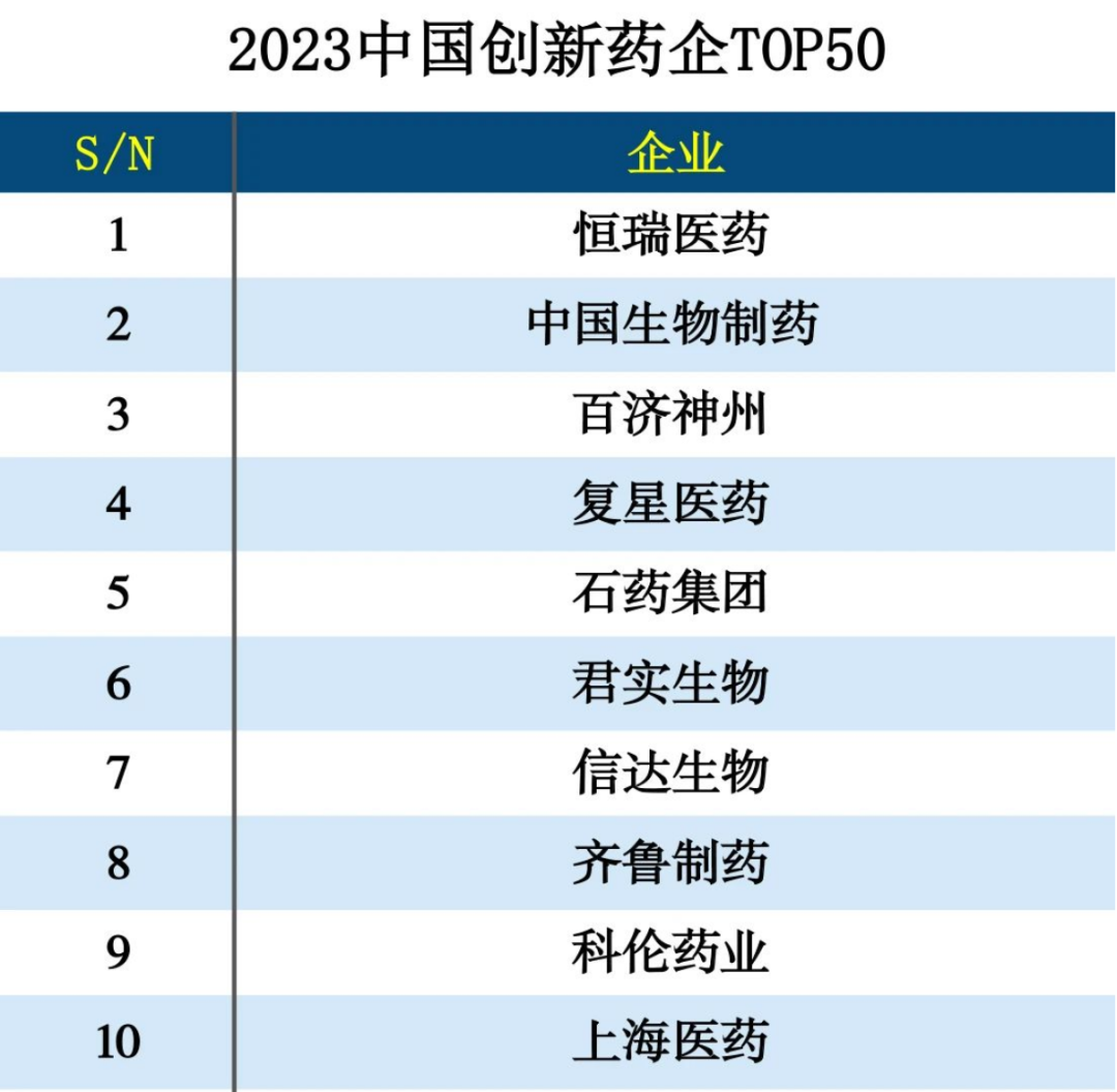 中國(guó)生物制藥入選2023中國(guó)創(chuàng)新藥企TOP50,位列第2