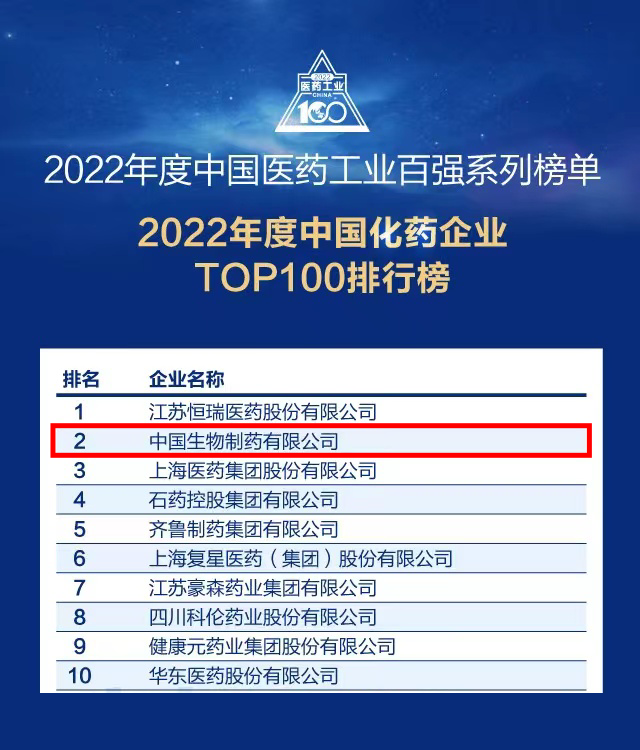 6月27日,“2022年度中國醫藥工業百強系列榜單”在湖州發布。中國生物制藥憑借扎實的研發生產實力和穩健的市場推廣能力,在“2022年度中國化藥企業TOP100排行榜”中排名第二。中國醫藥工業百強系列榜單,由專家委員會依托米內網在中國獨家開發運行多年的三大終端六大市場終端格局數據庫,針對醫藥工業企業,從創新驅動力和專業推廣力這兩大最重要的維度出發,最終評選揭曉,因此在業內具有相當高的權威性和認可度。
