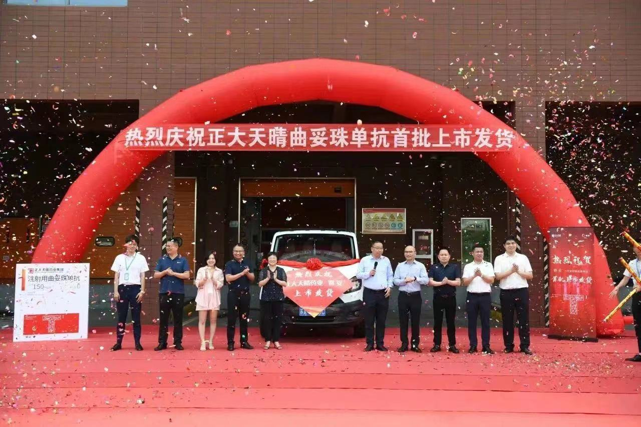 7月31日,由中國生物制藥附屬公司正大天晴研發生產的注射用曲妥珠單抗生物類似藥(商品名:賽妥)在江寧廠區完成首批發貨。公司研發、生產、質量、供應鏈和市場等相關部門負責人共同見證了賽妥由南京發往全國各地。