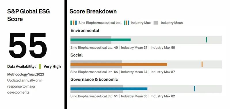 標普全球企業可持續發展評估是全球最大規模的企業可持續發展實踐年度評估之一,通過將企業的各項ESG管理和績效表現量化打分,全面反映企業的ESG管理和信息披露水平,是全球投資者投資決策和數據分析的重要依據。2023年,全球約350家醫藥行業企業受邀參與評估。連續兩年榮獲優于全球91%參評同行企業的成績,代表著機構對中國生物制藥可持續發展實踐的高度認可。