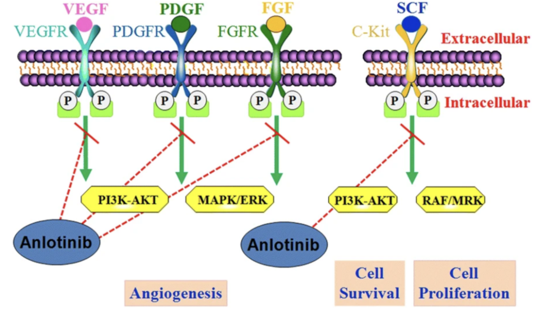安羅替尼作為一類抗血管生成多靶點(diǎn)小分子酪氨酸激酶抑制劑(TKI),可以靶向血管內(nèi)皮生長(zhǎng)因子受體(VEGFR)、成纖維細(xì)胞生長(zhǎng)因子受體(FGFR)、血小板源性生長(zhǎng)因子受體(PDGFR)和c-kit,有效抑制腫瘤血管生成和腫瘤細(xì)胞增殖3
