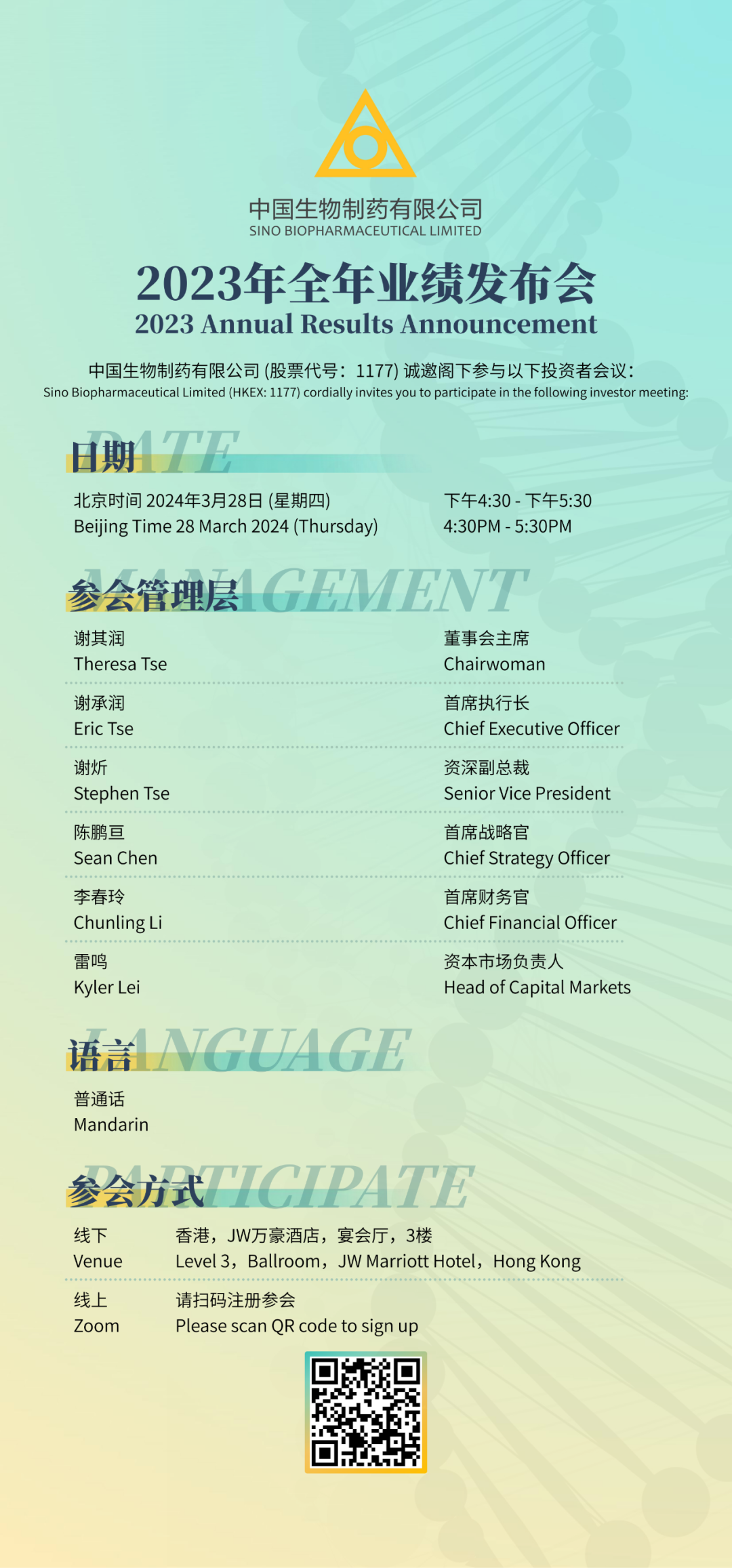3月28日·香港 | 中國生物制藥2023年全年業(yè)績發(fā)布會邀請函