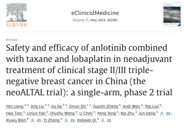 [1] Liang Y, Qi X, et al. Safety and efficacy of anlotinib combined with taxane and lobaplatin in neoadjuvant treatment of clinical stage II/III triple-negative breast cancer in China (the neoALTAL trial): a single-arm, phase 2 trial. EClinicalMedicine. 2024;71:102585.