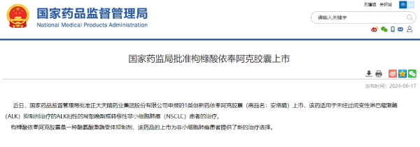 又一款針對ALK陽性非小細胞肺癌的國產(chǎn)靶向藥物面世,將給相關(guān)患者帶來新的選擇。6月17日,國家藥監(jiān)局官網(wǎng)顯示,中國生物制藥(1177.HK)下屬企業(yè)正大天晴藥業(yè)集團申報的1類創(chuàng)新藥依奉阿克膠囊(商品名:安洛晴)獲批上市,適用于未經(jīng)過間變性淋巴瘤激酶(ALK)抑制劑治療的ALK陽性的局部晚期或轉(zhuǎn)移性非小細胞肺癌(NSCLC)患者的治療。這也是4月底以來,中國生物制藥獲批的第三款1類創(chuàng)新藥。