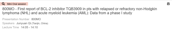 800MO-TQB3909(BCL-2抑制劑)治療復(fù)發(fā)或難治性非霍奇金淋巴瘤和急性白血病的I期研究首次分析結(jié)果