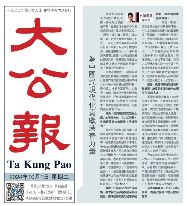 大公報 | 謝承潤:為中國式現代化貢獻港青力量