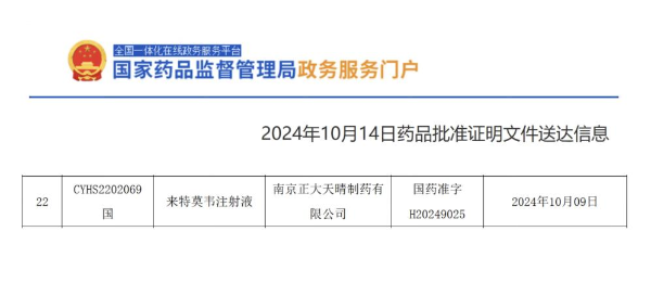 10月14日,中國國家藥品監督管理局(NMPA)官網顯示,中國生物制藥(1177.HK)下屬企業南京正大天晴抗病毒領域產品——來特莫韋注射液獲批上市,為該品種國內首仿。本品用于接受異基因造血干細胞移植(Allo-HSCT)的巨細胞病毒(CMV)血清學陽性的成人受者[R+]預防巨細胞病毒感染和巨細胞病毒病。