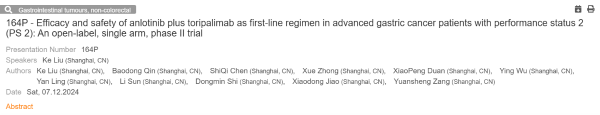 [3] Ke Liu ,el al.Efficacy and safety of Anlotinib plus Toripalimab as first-line regimen in advanced gastric cancer patients with performance status 2 (PS 2): an open-label, single arm, phase II trial.2024 ESMO ASIA.