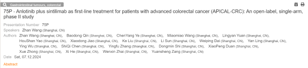 [2] Zhan Wang ,el al.Anlotinib plus Sintilimab as First-line Treatment for Patients with Advanced Colorectal Cancer (APICAL-CRC): an Open-Label, Single-arm, Phase II study.2024 ESMO ASIA.