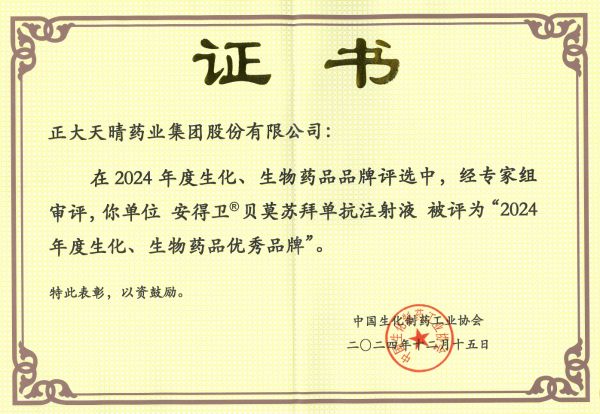 中國生物制藥貝莫蘇拜單抗榮獲“生化、生物藥品優(yōu)秀品牌”
