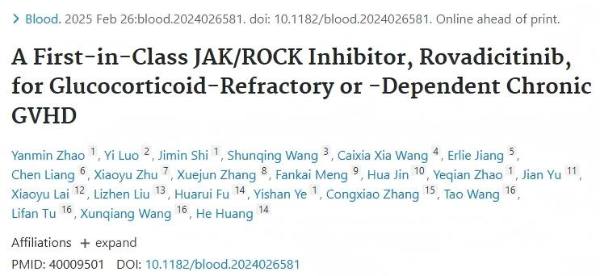此次見刊《Blood》的臨床研究,是一項在中國進行的開放標簽、多中心的Ib/IIa期臨床,主要聚焦于評價羅伐昔替尼治療糖皮質激素難治性或依賴性慢性移植物抗宿主病的安全性和有效性。