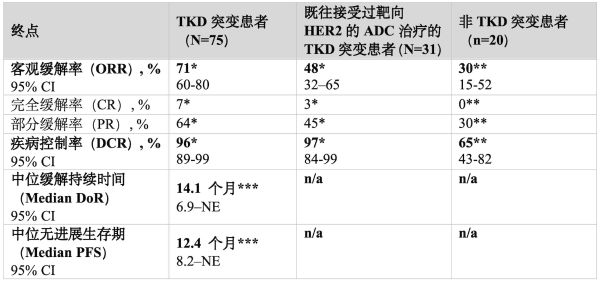 初步結果顯示,在既往接受過含鉑化療和靶向HER2的抗體偶聯藥物(ADC)(N=31)治療的TKD HER2突變晚期非小細胞肺癌(NSCLC)經治患者中,客觀緩解率(ORR)為48%(95% CI:32-65),疾病控制率達97%(95% CI:15-52)。此外,在HER2非酪氨酸激酶結構域突變的晚期非小細胞肺癌經治患者中開展的探索性隊列研究(n=20)顯示,研究者評估的客觀緩解率(ORR)為30%(95% CI:15-52),疾病控制率(DCR)為65%(95% CI:43-82)。此為目前已知規模最大的HER2非酪氨酸激酶結構域突變的晚期非小細胞肺癌經治患者數據。上述兩組數據均在2025年AACR年會上發布,并同步刊發于《新英格蘭醫學雜志》。