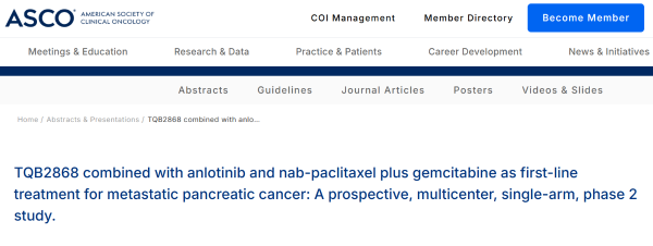 [5] Si Shi, Xianjun Yu,Xiaobing Chen, et al. TQB2868 combined with anlotinib and nab-paclitaxel plus gemcitabine as first-line treatment for metastatic pancreatic cancer: A prospective, multicenter, single-arm, phase 2 study.2025 ASCO(#4159).