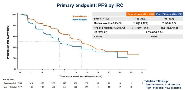 ●本次公布的結果為主要終點PFS的最終分析數據,“得福組合”治療組和帕博利珠單抗治療組的中位隨訪時間分別為11.4月和10.6月,數據成熟穩健。
