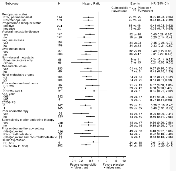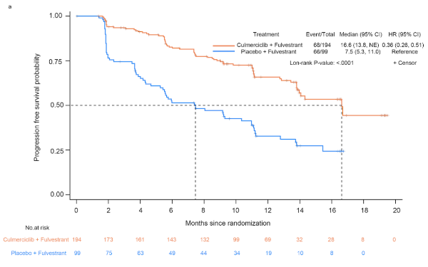 2022年3月18日至2023年3月3日期間,共293例患者符合條件入組。入組患者的中位年齡為53歲,既往均接受過內分泌治療,23.3%因復發或轉移性疾病接受過全身化療,21.5%的患者為原發性內分泌耐藥,59%的患者存在內臟轉移。入組患者按2:1的比例接受庫莫西利聯合氟維司群或安慰劑聯合氟維司群治療,兩組在人口學和基線特征方面總體均衡。