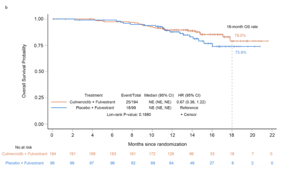 中位隨訪時間為13.8個月,此時兩組的中位總生存期(mOS)均未達到。18個月OS率方面,庫莫西利組對比安慰劑組為79.0% vs. 73.9%(p=0.188)。庫莫西利組ORR為40.2%(95% CI:33.3–47.5),對照組為12.1%(95% CI:6.4–20.2)。