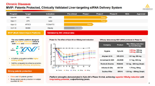 ·Kylo-04:基于MVIP平臺開發的Kylo-04在乙肝(HBV)治療的Ib期臨床試驗中,取得了優于同行的HBsAg(乙肝表面抗原)降低效果,400mg劑量組降幅高達3.29log,展現出卓越的療效和持久性以及MVIP平臺高效的遞送效率。