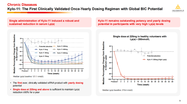 ·Kylo-11:基于該平臺開發的治療高Lp(a)血癥的小核酸產品Kylo-11,臨床研究數據顯示單次給藥225mg,即可誘導血清Lp(a)水平降低超過90%,效果持續時間長達一年;即使在基線Lp(a)水平極高的受試者中,Kylo-11依然能實現并維持約90%的降幅,展現了全球同類最佳(BIC)的潛力,有望為心血管疾病的預防和治療帶來革命性改變。