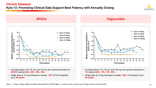 ·Kylo-12:基于該平臺開發靶向APOC3的Kylo-12,在針對高甘油三酯血癥(sHTG)的治療中也顯示出強大的臨床潛力,單次給藥10mg即可在40周后仍維持約70%的APOC3和約60%的甘油三酯(TG)降幅,且療效呈現顯著劑量依賴性,預示其同樣具備一年給藥一次即可實現顯著獲益的潛力。