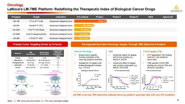 秦瑩介紹,禮新醫藥的核心競爭力在于其獨特的LM-TME平臺。該平臺旨在解決腫瘤生物藥領域一個根本性挑戰:如何在保持強效殺傷的同時,降低系統性毒性。LM-TME平臺利用腫瘤組織中某些生化因子(R因子)濃度遠高于正常組織的特性,設計出TME選擇性激活的抗體藥物,進而“重新盤活”CTLA-4等歷史上因毒性受限的靶點。并且,LM-TME是目前已知唯一涵蓋單克隆抗體(mAb)、抗體藥物偶聯物(ADC)和T細胞銜接器(TCE)三種藥物形式的TME依賴性抗體發現平臺,是一款用于開發差異性創新生物藥的強大引擎。