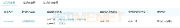 全球在研的DLL3/CD3雙抗藥物中,勃林格殷格翰的BI764532進度靠前,小細胞肺癌和其他神經內分泌癌的II期臨床試驗正在進行中,且被FDA授予快速通道認定,用于治療表達DLL3的晚期或轉移性肺大細胞神經內分泌癌,同時小細胞肺癌適應癥也被授予孤兒藥認定。
