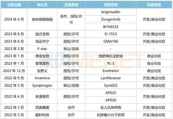 2022年至今中國生物制藥部分BD交易