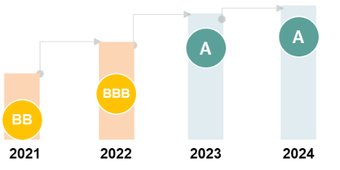 MSCI是當前全球資本市場最受關注與認可的ESG指數評級機構之一,其評級結果已成為國際資本市場的主流投資參考依據。2021年至2023年,中國生物制藥MSCI ESG評級連續三年由BB級穩步提升至A級。本年度再次獲評A級,代表著資本市場對中國生物制藥在ESG領域的實踐表現以及集團長期價值的持續認可。